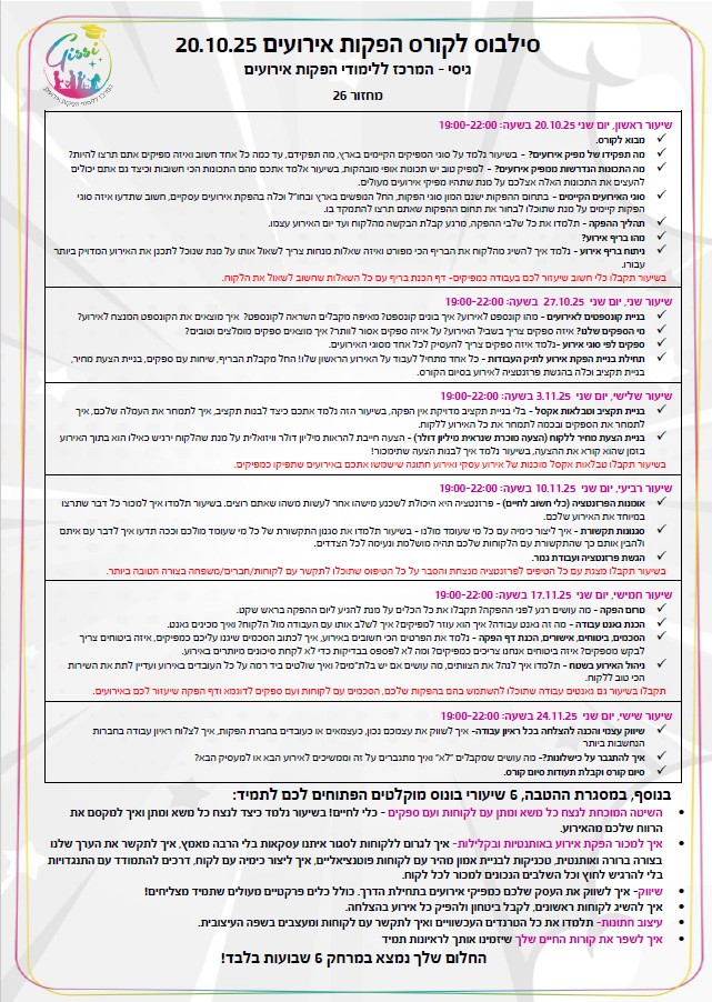 שאלות אלו הובילו אותי במשך שנה שלמה, ערב אחר ערב, לחשוב, לתכנן ולדייק עד שהצלחתי לייצר את הקורס המושלם שיהפוך כל אדם, גם ללא ניסיון – למפיק אירועים בתוך 6 שבועות בודדים – וזאת במחיר לכל כיס.